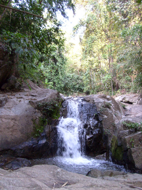 Na ja, also Wasserfall ist eben eine Frage der Definition. Nach unserer Vorstellung isses das nicht gerade gewesen aber dennoch, viele Felsen und viele Wasserkaskaden eben und eine tropische Vegetation dazu. Alles prima und alle zufrieden. Bei den schweißtreibenden Temperaturen tat die Erfrischung recht gut. Das Wasser war recht kühl und alle wateten durchs kühle Nass. Langsam neigte sich der Tag dem Ende entgegen und wir machten uns auf nach Phayao. Über die Berge bei Dunkelheit zu gefährlich, also lieber einen Umweg von 80 km, Chiang Mai, Lampang, Phayao. In Lampang fing es heftig an zu regnen, na toll, so wie hier Auto gefahren wird... Drei heftige Unfälle auf dem Wege nach Phayao waren dann auch so ein Erlebnis für uns, ohne Beteiligung selbstverständlich. Nach etwa drei Stunden waren wir in Phayao, es hatte aufgehört zu regnen, saßen wir am See und speisten wie immer vorzüglich. Wir unterhielten uns noch recht lange und legten uns einen Plan zurecht, wo es am nächsten Tag hingehen sollte. Nach dem Reinfall bei dem Menschenzoo wollte ich meinen Freunden abseits des Tourismus zeigen, wie ein Bergvolk lebt, und zwar ohne Eintritt und Show. Weiter in der nächsten Ausgabe: Fahrt in die Berge, nach Ban Yao/Pang Pu Lo zu einem Bergvolk und weiter zu einer Tempelanlage in der Nähe von Phayao.