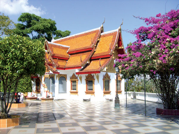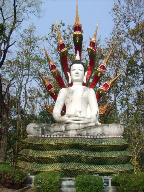 Das haben wir auf unseren Touren überall mitbekommen, kaum bzw. keine Touristen. Für die hier lebenden, vom Tourismus abhängigen, Thais eine Katastrophe. Nach einer halben Stunde setzten wir unsere Fahrt in Richtung Chiang Mai fort. Eine herrliche tropische Vegetation begleitete uns. Riesige Tropenbäume säumten unseren Weg. Obwohl es nicht sehr weit aussah (laut Karte 222 km Phayao-Chiang Mai) waren wir nun schon vier Stunden unterwegs. Nur gut, dass ich so früh unsere Tour angegangen bin. Es dauerte dennoch eine gute Stunde bis wir Chiang Mai erreichen sollten. Dort angekommen war unser erstes Ziel Nordthailands größtes buddhistisches Heiligtum, die Tempelanlage Phra That Doi Suthep, hoch oben in den Bergen gelegen, thront dieser prachtvolle Tempel über der Stadt Chiang Mai. Allerdings ging es erst wieder Serpentine für Serpentine bergauf.