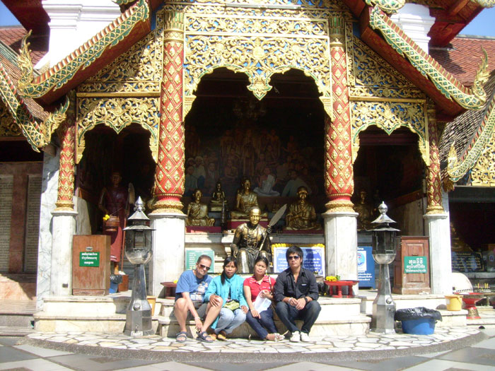 Unterhalb der Tempelanlage lag ein großer Parkplatz mit vielen Lokalitäten, was uns alle zum Essen ermunterte, bevor der nun zu Fuss gehende Aufstieg beginnen sollte. Nach einem leckeren Thaigericht lässt sich das auch locker angehen. Die Temperaturen, es war so 13 Uhr, waren wie immer schweißtreibend. Nun gibt es zwei Möglichkeiten des Aufstiegs. Entweder die große Treppe ca. 300 Stufen zu Fuss oder einen, na sagen wir mal, Aufzug nehmen. Da die Tempelanlage ca. 1.700 Meter über dem Meeresspiegel liegt, kam für mich nur die zweite Variante in Frage. Alle anderen, auch unser Raoul (83), nahmen die 300 Stufen. Ich hatte das ja auch schon mal gemacht, die Stufen, bei den Temperaturen! und als ich oben war, hat meine Lunge "Hallo Winny" gesagt. Bin zusammen geklappt wie ein Taschenmesser, weil Asthmatiker. Also auf jeht det... ich per Lift, die Anderen über die Treppe. Oben angekommen erstmal Pause. Schuhe ausziehen für Buddha, die Blumen und Räucherstäbchen kaufen und dann ins Innere der Tempelanlage. Zuerst haben wir den Stupa im Zentrum umrundet und die üblichen Rituale zelebriert. Im Anschluß dann alles besichtigt.