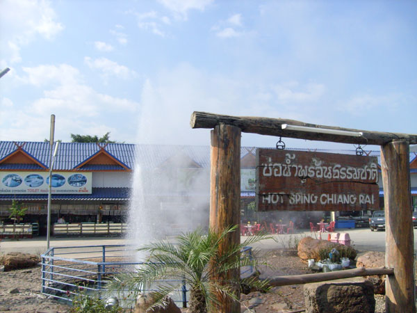 In Ban Mae Kachan angekommen, vorsichtshalber volltanken, denn in solchen zusammenhängenden Waldgebieten gibt es oft keine Tankstelle mehr. Dann nach links die Strasse 118 direkt nach Chiang Mai und wieder hinein in die Berge. Erneutes Staunen, weil die Vegetation wechselte. Plötzlich, wir trauten unseren Augen nicht, waren da rechts der Straße riesige Wasserfontänen zu sehen, und ich hielt sogleich an. Was war das, wollten wir wissen. Als wir aus unserem klimatisierten Auto ausstiegen roch es nach faulen Eiern. Mir war sofort klar, hier sind heisse Quellen, und das muß Schwefelgeruch sein. So wars dann auch. In Nordthailand wackelt ja öfter mal die Erde, jedenfalls in den letzten Jahren, wie ich auch schon berichtet habe. Hier waren wir also mitten drin im Erdbebengebiet. Wohl ist mir dabei nicht gewesen - HOT SPRINGS CHIANG RAI - nennt sich dieser Ort, Thailands höchster Geysir. Mehrere kleine Geysire waren auch noch zu bestaunen, und überall an diesem Ort kam heißes Wasser aus der Erde. Eine Touristenattraktion, grosse Parkplätze für Reisebusse und allerlei Souvenierläden. Was fehlte... waren die Busse mit den Touristen.